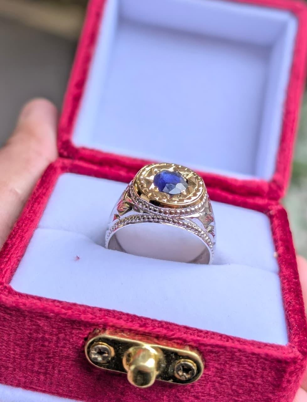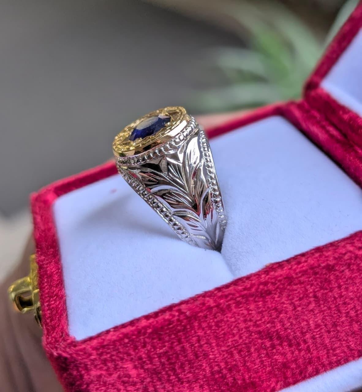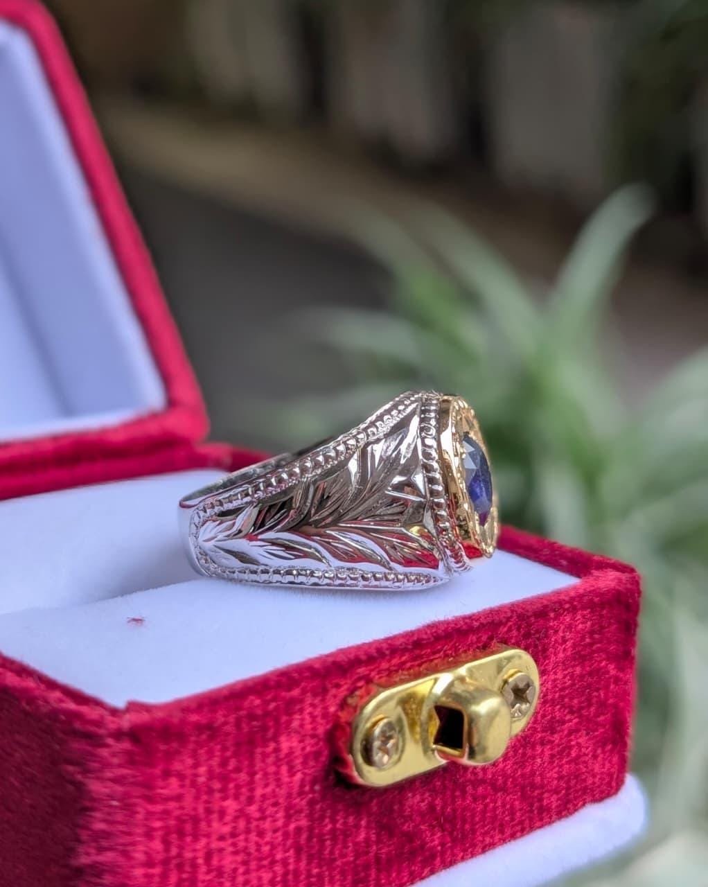 This luxury blue sapphire (Neelam) signet is a powerful blend of traditional craftsmanship and modern elegance. Carefully handcrafted with intricate engraving, this piece is designed for men who appreciate bold style, spiritual significance, and timeless luxury.