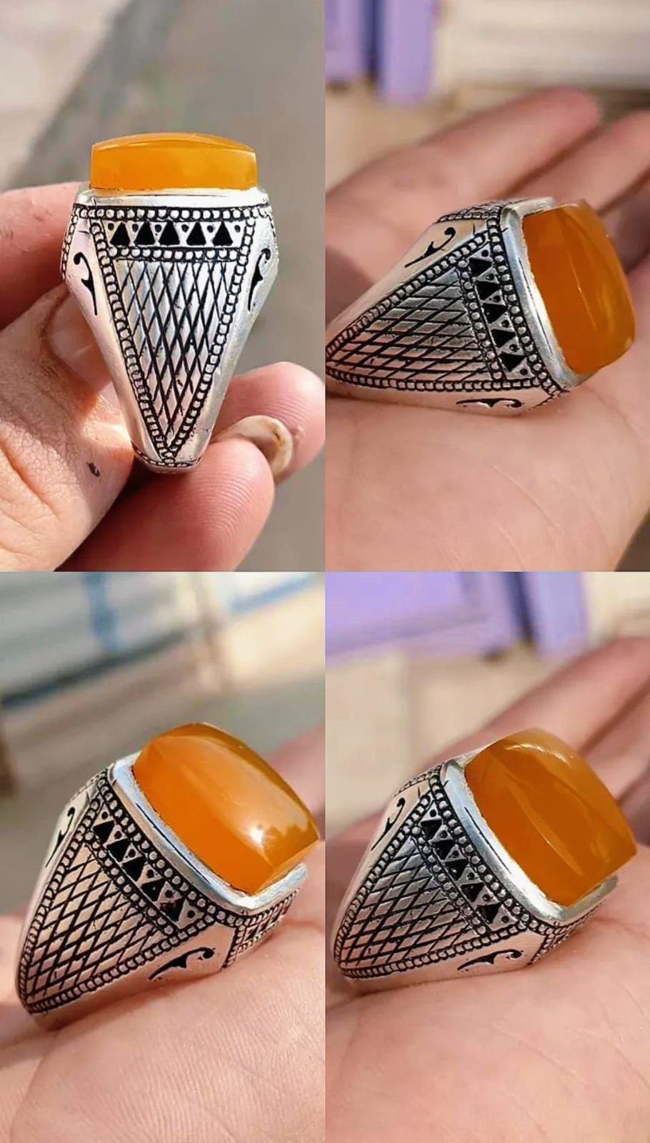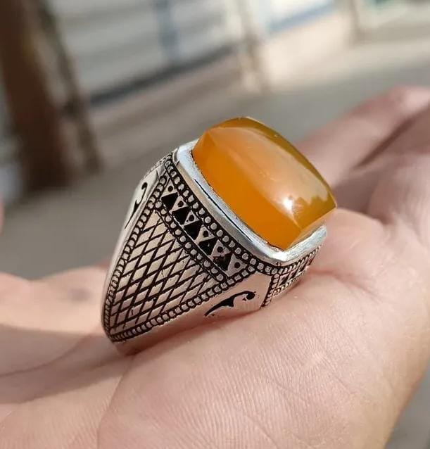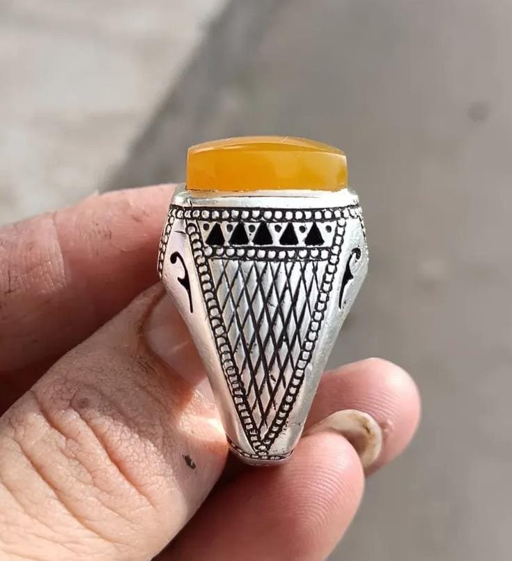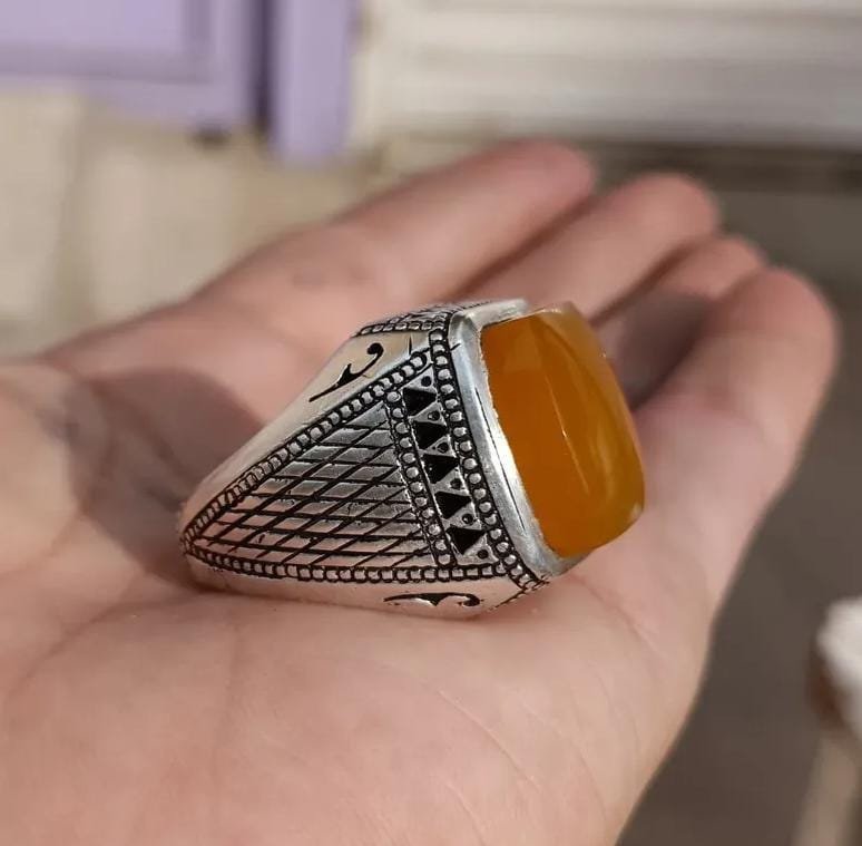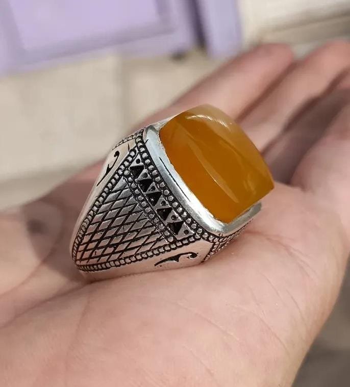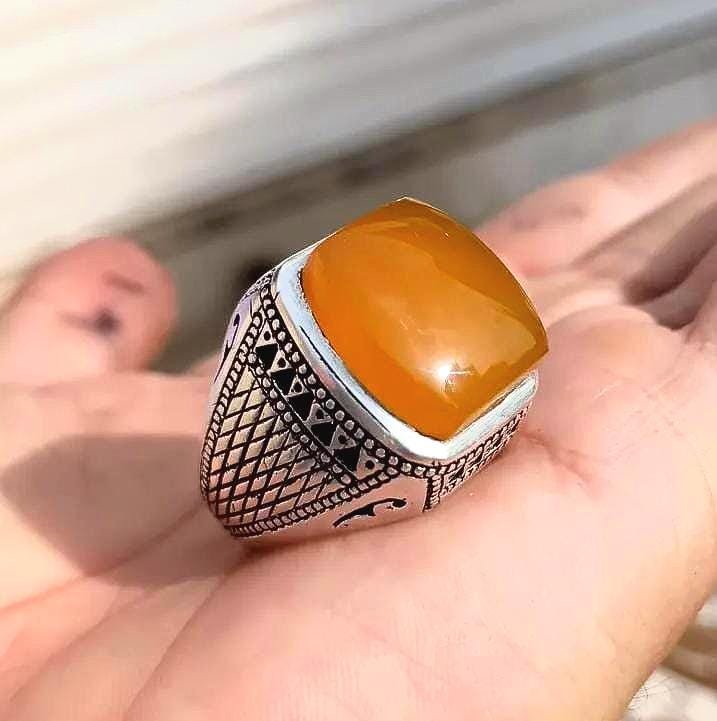 Handmade Yemeni Aqeeq Yellow stone Agate Ring for Men, 925 Sterling Silver, Valentine Gift