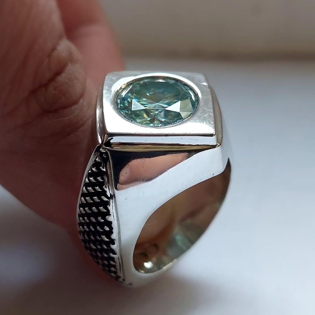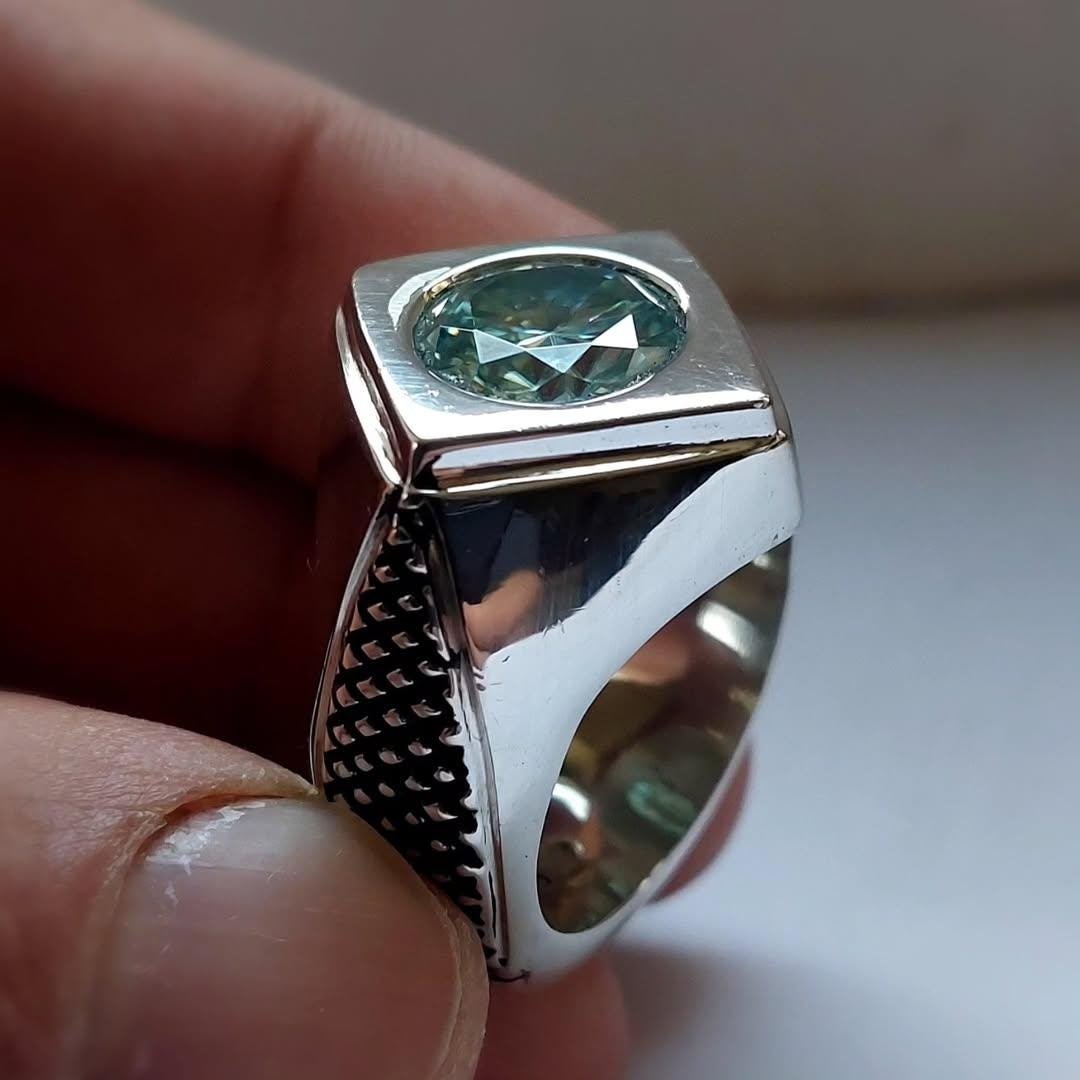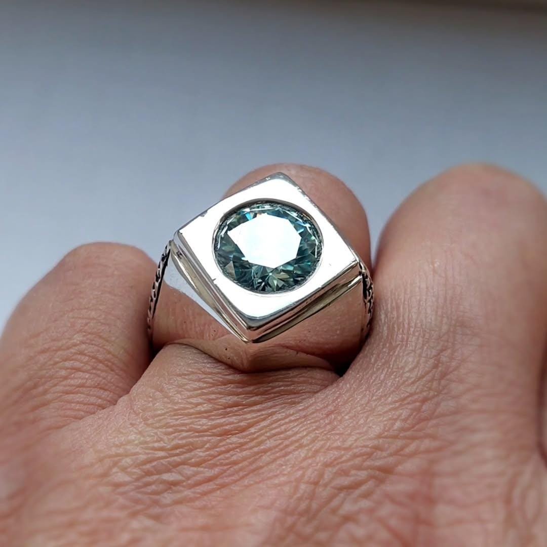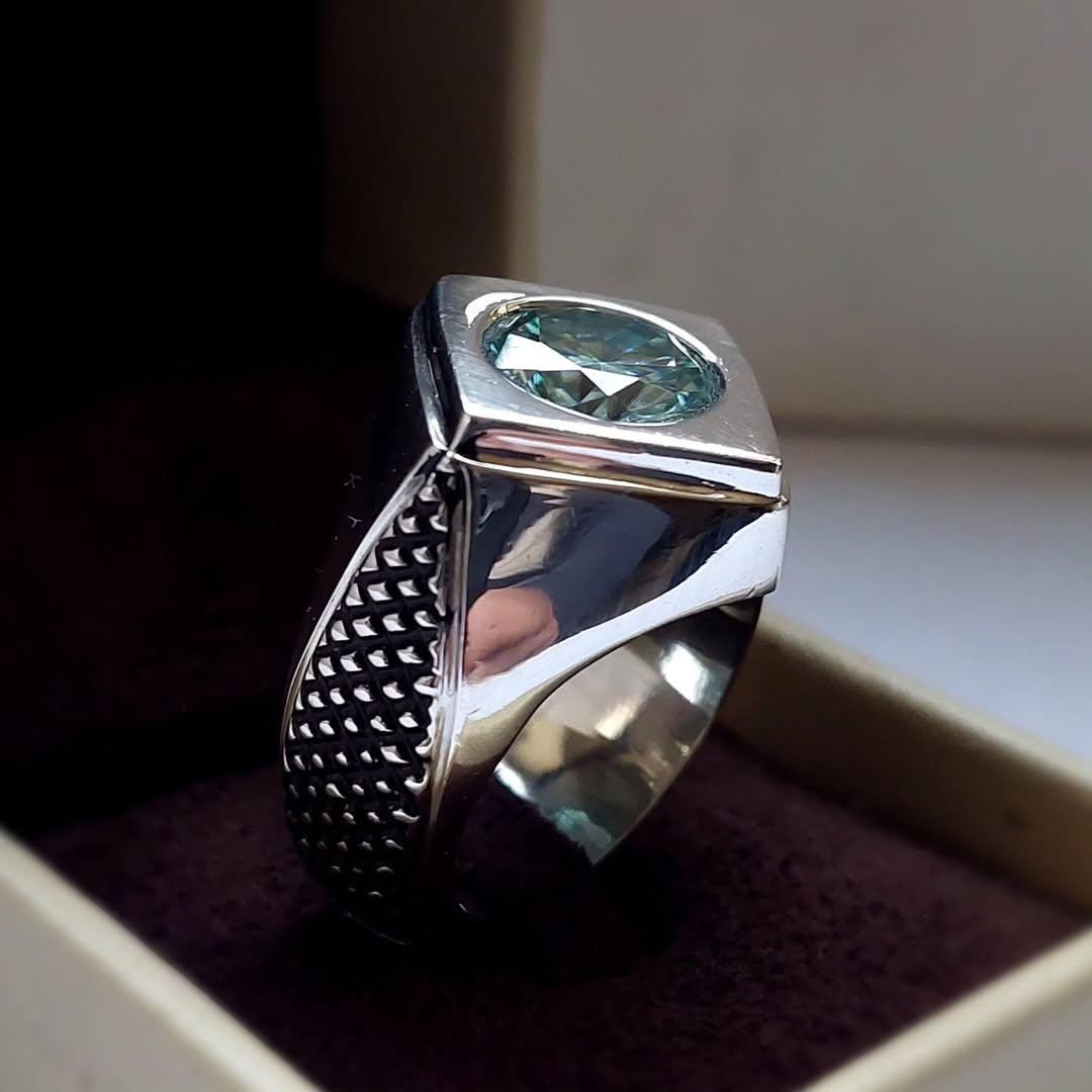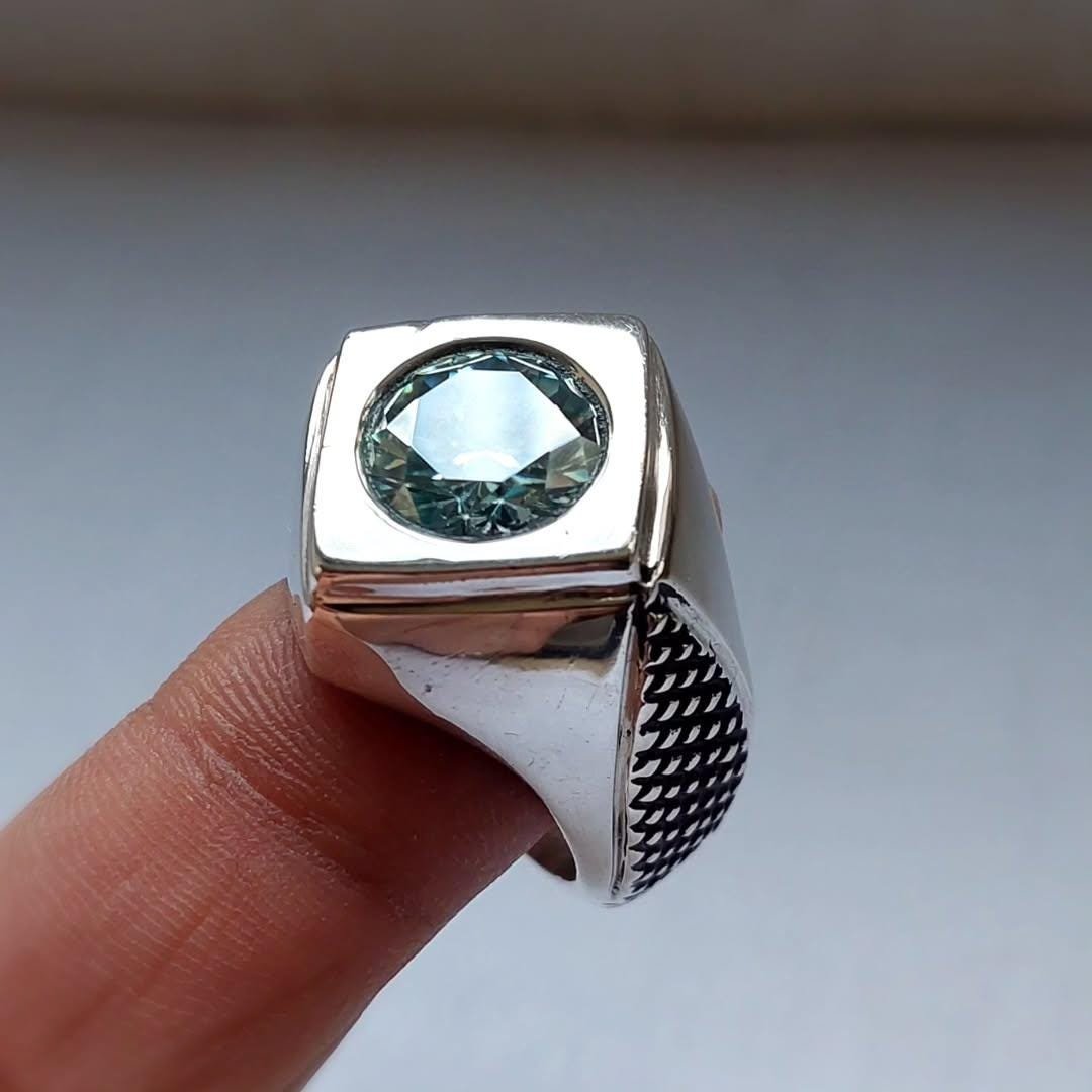 Step up your style game with this stunning Mens Green Moissanite Ring. This piece features a vibrant, round-cut Green Moissanite stone set in a sleek, square bezel setting, creating a bold geometric look. The robust silver band is accented with a unique textured pattern on the sides, adding depth and character. Perfect as a modern wedding band, a statement accessory, or a special gift, this ring combines the brilliance of moissanite with contemporary design.
