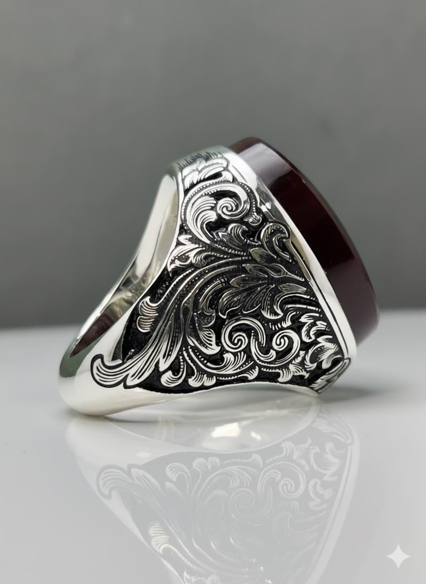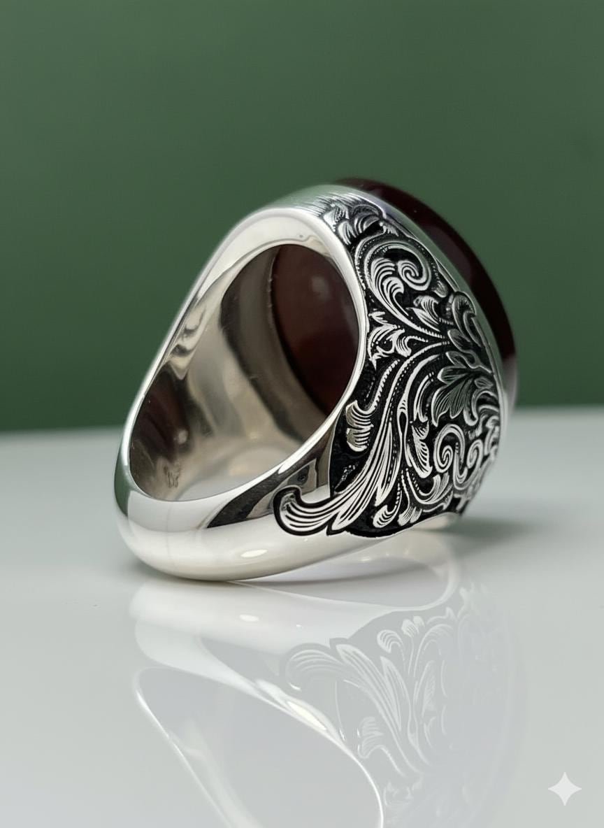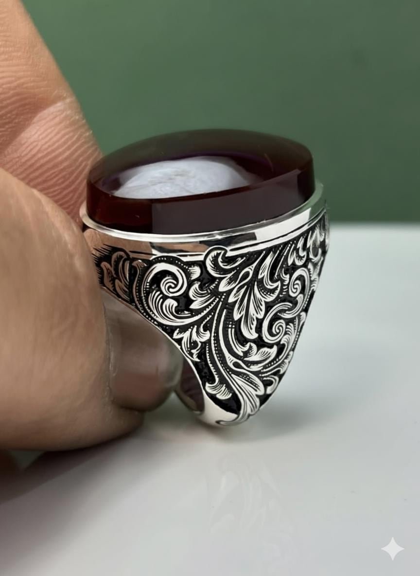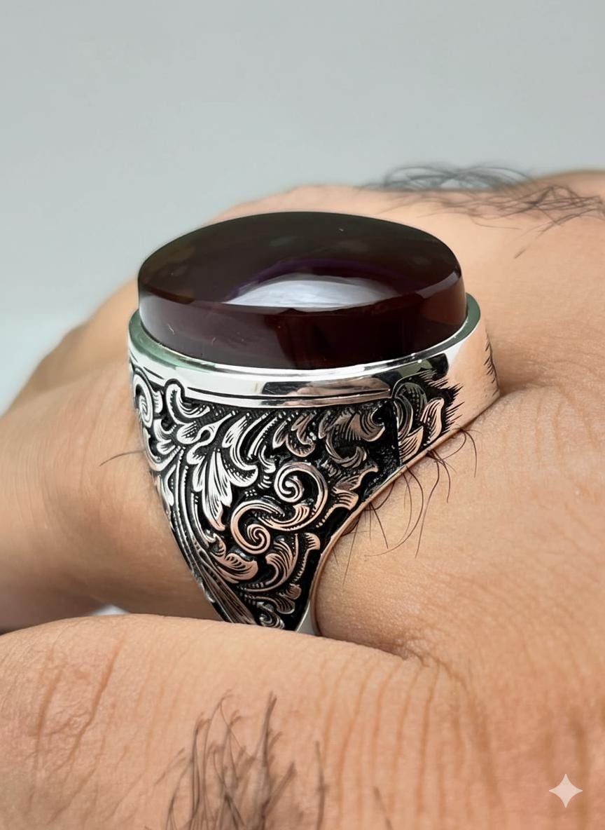 Ottoman Style Aqeeq Stone Ring: 925 Sterling Silver Handmade Mens Ring